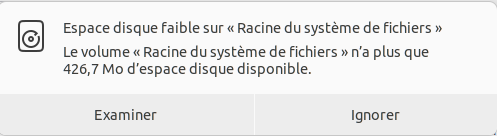 ) j’ai plus ou moins régulièrement un message me disant que l’espace disponible du volume racine est faible.