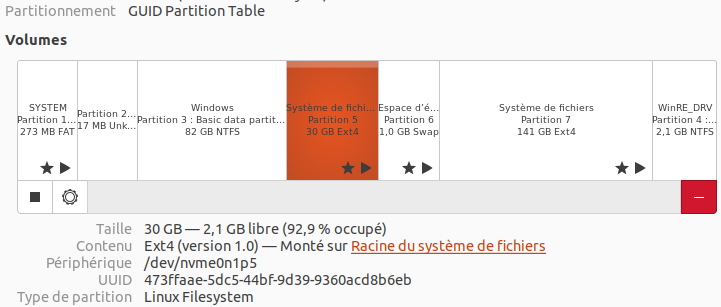 A l’installation de Ubuntu, j’avais pris l’option de mettre le volume racine sur une partition séparée, l’avantage annoncé était qu’en cas de réinstal, on ne touche qu’au système et pas les données.