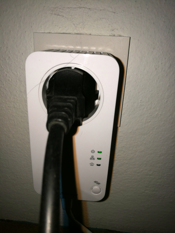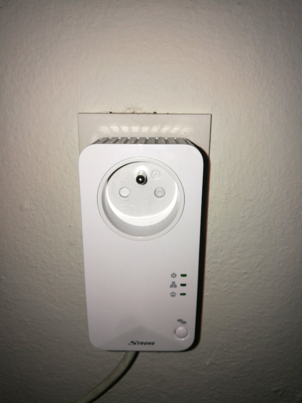 Ensuite, dans cette même pièce, on a un cpl (image ci-dessous) avec les trois lampes allumées et qui fonctionne puisque ma coloc (dont la chambre est aussi à l’étage comme moi) qui est connectée avec celui-là me dit qu’elle a internet sur son ordi.